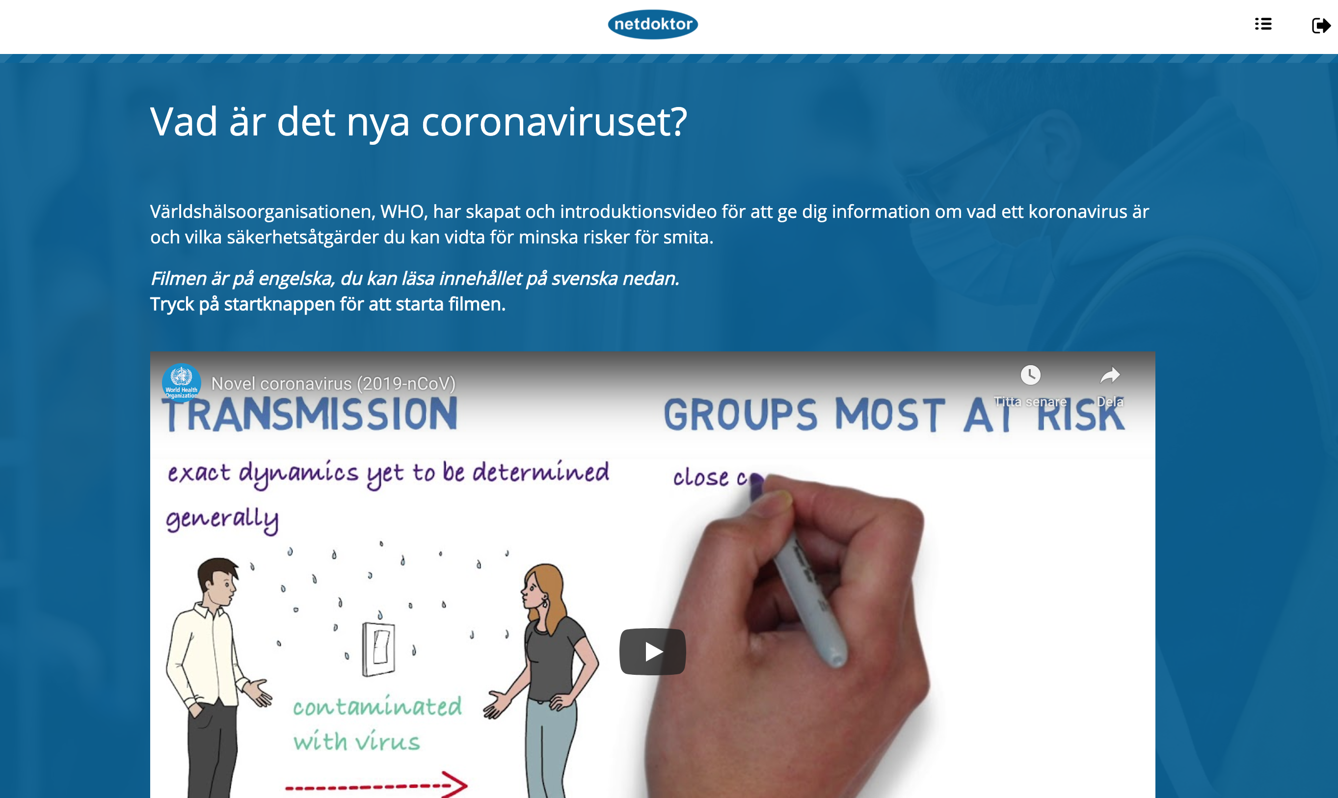 Den 6 mars lanserade Netdoktor en utbildning för allmänheten om det nya coronaviruset och sjukdomen covid-19. En månad senare har 7500 personer tagit del av utbildningen. Faktabladet om samma ämne har haft 37 500 unika besök sedan artikeln publicerades den 3 februari.